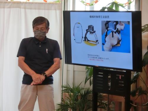 | 今年は熱中症についても再確認ができました。 子どもの感じる暑さ指数が大人とちがうため、より細心の注意が必要です。 園に常備している器械をつかって、戸外遊び時には測定しています。 | 「自動心肺蘇生器」熊本市の救急車には塔載されているそうです。この機械が絶え間なく蘇生することで、救命率もあがり効果が出ているようです。早く全救急車に塔載されるといいですね。 |