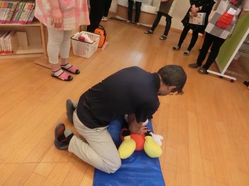 | | 水の活動が始まります。事故が起こらないことが一番ですが、もしもに備えて、全職員で研修に取り組みます。 | 新任の先生も心肺蘇生法を学び、大切な命を守る練習を行いました。 | チームで対応することで、命を救うことにつながります。 「代わります。123はい!」 連携もばっちりです。 |