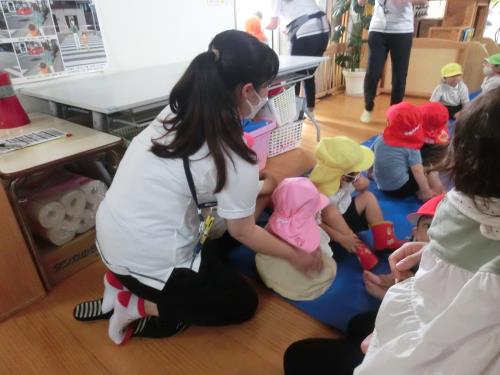 | 大切な頭を守ることが大切であることを伝えました。 ダンゴムシ!子どもたちにとって共通言語です | らっこ組さんのダンゴムシは・・・ごろりとねる。となっていました。例えでもわかりにくい年齢があるようです | うさぎさんのダンゴムシ。小さく頭を守るポーズができています。 |