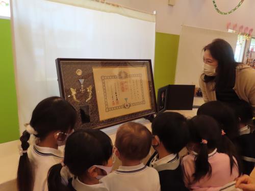 | | きらきら輝く勲章にみんなの心も釘付けになっていました。 | 菊の御紋について、話を聞き実際に目にすることで理解も深まりました。 | いつもはこれは?これは?と興味を持ったことを尋ねるこども達ですが、この時ばかりは真剣に見入っていました。 |