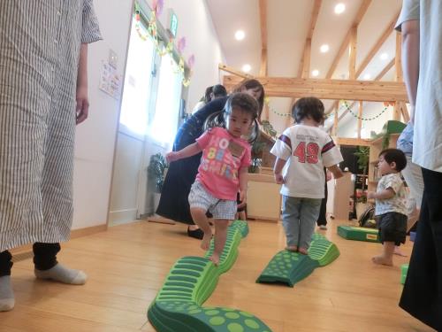 ~本のお部屋での活動も2回目です。親子で体操をしたり、「ぞうくんのさんぽ」の絵本に合わせてくねくね平均台やジャンピングマット・トンネルをつかってみんなで散歩に出かけました。~