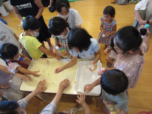 今日も雨が降ったので、水遊びはできませんでした。ペットボトルを準備して頂いたので、穴をあけて「シャワーつくり」をしました。ビニールテープで飾りつけにも挑戦。思い思いに色とりどりのテープを貼り出来上がっていく様子を楽しむことができました。また、ビニール袋にカラービニールを入れて、魚もつくりプールに入れて遊びました。世界に一匹だけのきれいな魚にみんな喜び、一緒にボールプールの中で泳いで楽しかったね。