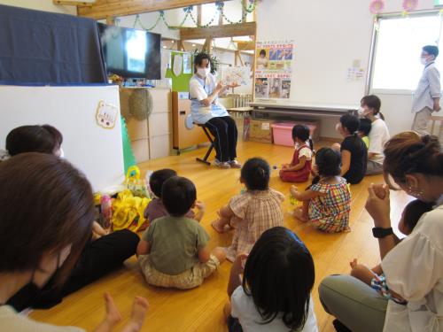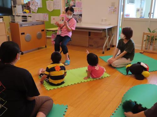 | 親子で絵本をよんだり、ゆったりと過ごしています。 | 始めは緊張してても、さよならの歌の時には、元気いっぱいです! |