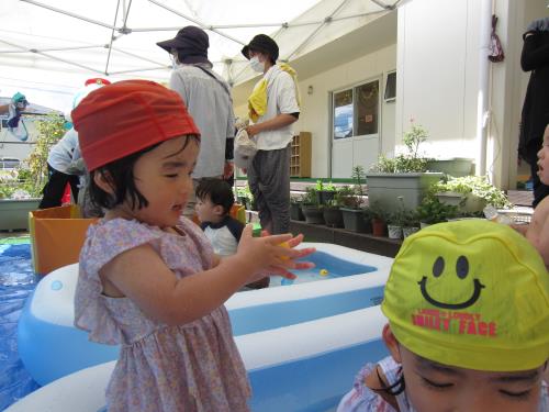 2回目の水遊び、在園児の兄弟も参加してくれました。新しいお友達の参加もありにぎやかな水遊びとなりました。貝殻を集めたり、ペットボトルのシャワーで遊んだり、思い思いに水の感触を楽しむことができました。顔にかかっても泣かずに遊ぶこともできていて、来年の水遊びが益々楽しみとなりました。保護者の皆様。暑い中ご参加ありがとうございました。