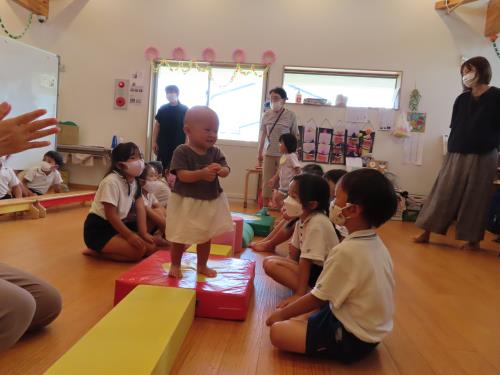 気を付けて渡ってね。 周りで見守りながら応援していました | グループごとに手遊びを披露し、先生役に少し恥ずかしそうな年長さんです。 | みんなも大きくなったらできるようになるよ!と鉄棒を見せてくれました。できる自信をアピールできたようです |