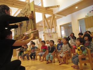 毎月誕生児の子ども達を囲んで、誕生会を行っています。 今月は、10月生まれの誕生会。自己紹介で名前や幾つになったのかを、みんなの前で堂々と発表することができました。“おめでとう”と言葉のプレゼントをもらい、おたんじょうびの歌を皆で唄う中で、祝ってもらう喜びを感じたり、人前で発表することで自信がついたりしています。 誕生日は、みんなが“赤ちゃんになって生まれた特別で大切な日”です。いつも成長を見守って下さるおうちの人に感謝の気持ちを持ち、からだもこころも成長していることをみんなで喜び、“大きくなること”を子ども達と感じていきたいです。 誕生会での後半は職員からの出し物があり、子ども達も楽しみにしています。今回はタングラム(分割パズルで、ある形の板を幾つかに分割してそれを組み直し、別の形にするパズル)で、子ども達がお昼ねしている間にこっそり練習していた先生たち。本番では、子どもたちと盛り上がり、楽しいひと時となりました。
