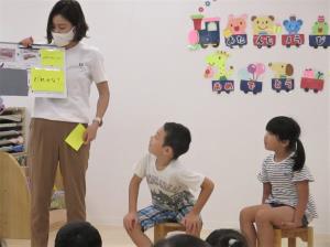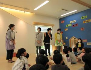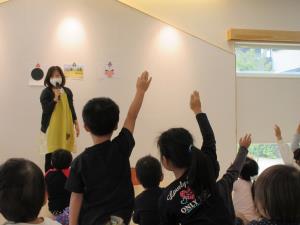 | | よーく考えてみよう!わかったら手を挙げてね! | 子ども達の誕生会の後は、先生たちの誕生日もお祝いします。 「何歳ですか?」 「みんなと同じ・・2歳!」 「え~!?ほんとに~!?」 がお決まりのやり取りです。 何歳になってもお祝いしてもらうことは嬉しいものです。 |
