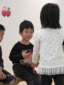 | | 園長先生からのお話しでは、『色々な赤ちゃん』を紹介。生き物の誕生や成長に興味を持っている子ども達です。 | 友だちからカードを受け取り、とても嬉しそうですね。「おめでとうございます!」「ありがとうございます!」 |