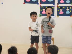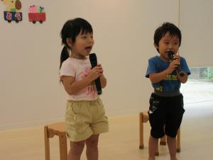 | | 歌えるようになった歌を披露し、笑顔が溢れます。聞いてもらえると嬉しいですね。 | お手伝いのお友だちと一緒に楽しく歌っています。 |