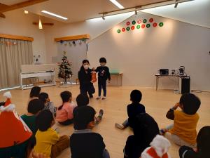 | 20日はクリスマス会を行いました。 クリスマスの由来について紙芝居を見た後は、クリスマスにちなんだ制作をどのように取り組んだか、それぞれクラス毎に発表してもらいました。会の途中ではサンタクロースからのメッセージも届き、みんな大喜び。また、以上児さんからのうた発表、先生たちによる合奏など楽しいひとときはあっという間に過ぎていきました。 きれいな電飾のツリー、楽しい歌やお話しは、きっと子どもたちの心に残る体験となったことと思います。
