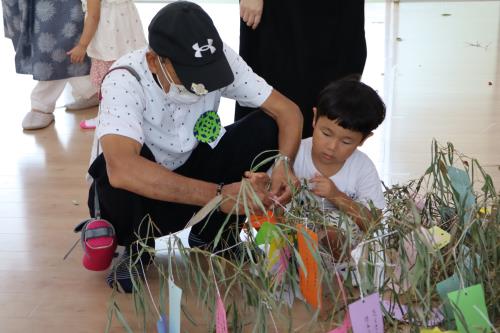 みんなどんな願い事を書いたのかな?おじい様とおばあ様と一緒に飾り作り