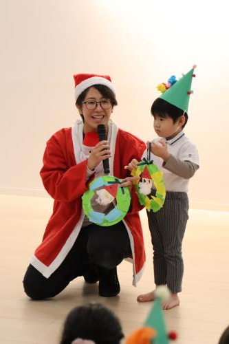 | | クリスマスについて、みんな集中してお話を聞いています。 | サンタクロースも遊びに来てくれました♪
