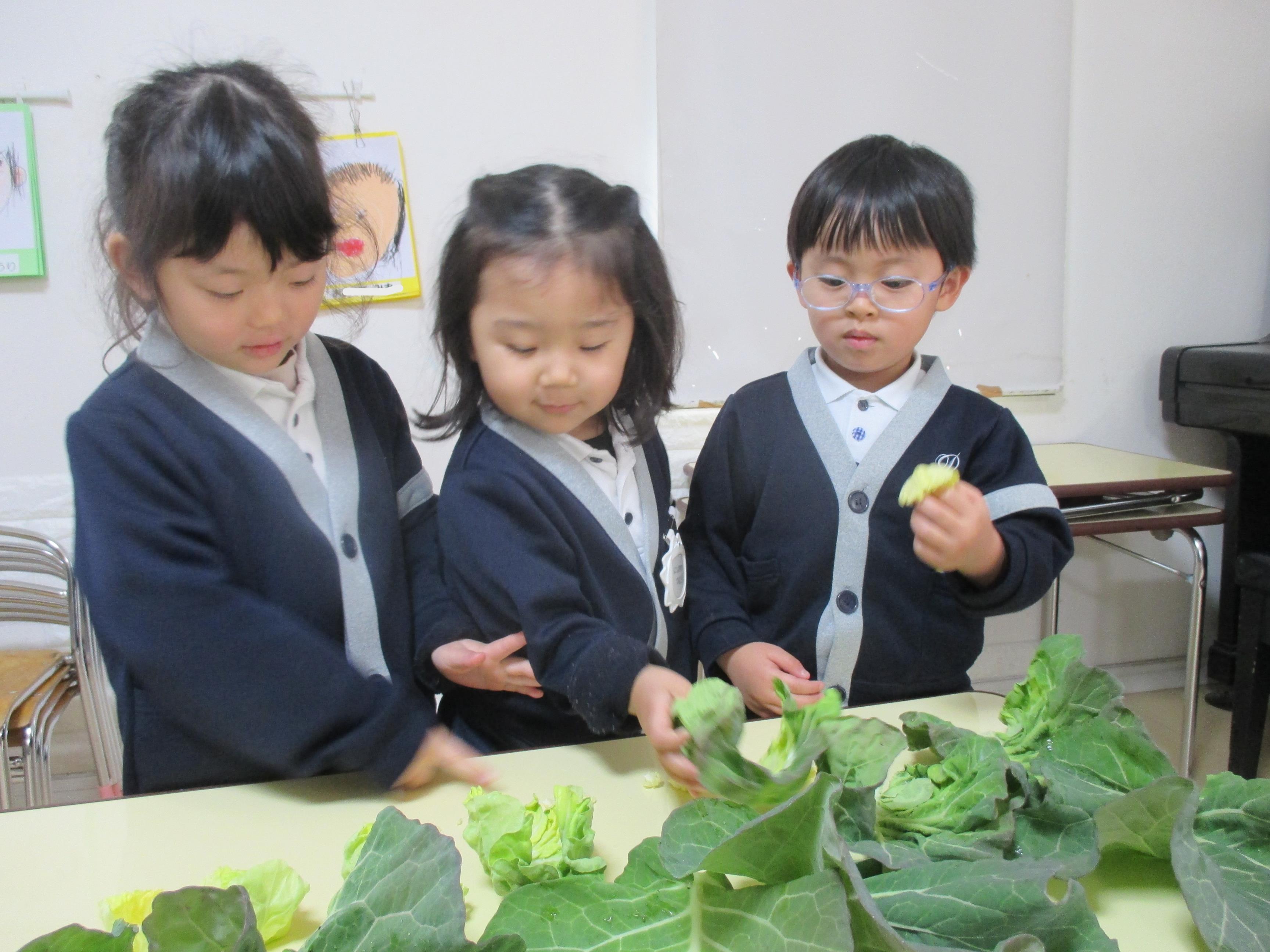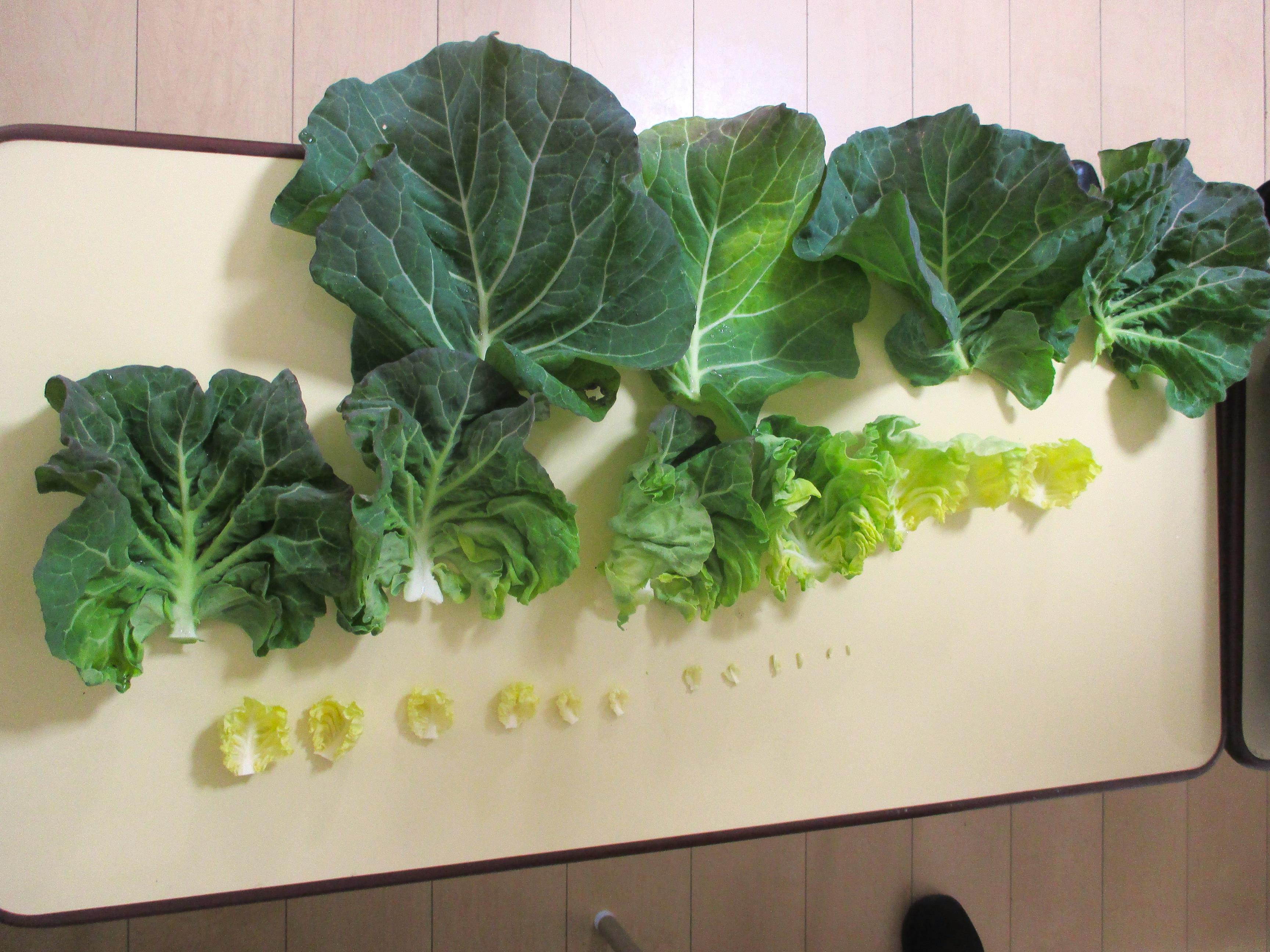 | | 大きなキャベツの葉の中は、こんな感じです | 数えてみよう! 色や大きさも違うね! |