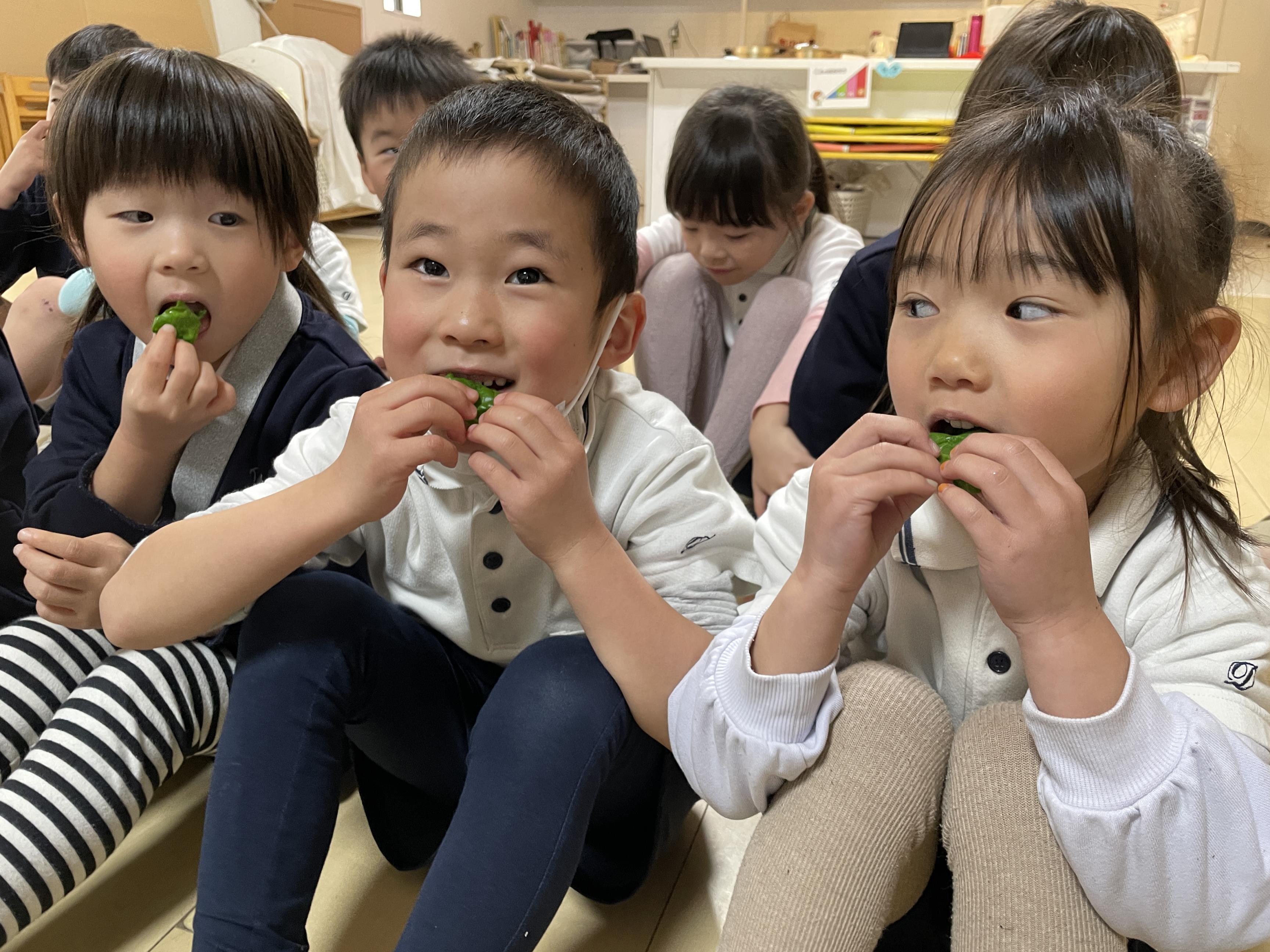 | 段々と温かい日差しを感じることが多くなりました。2月5日『啓蟄』を迎え、少しずつ生活の中で春の気配を感じているこどもたちです。 2月には、こども達が育てた野菜がどんなふうに育ったか、どんな味になったかなど、見たり触れたり、味わったりしながらそれぞれの気づきを伝え合い、収穫を喜びました。 また、3月2日のお別れ遠足では、親子みんなで1年間の成長を感じながら、和やかな時間を過ごすことができました。