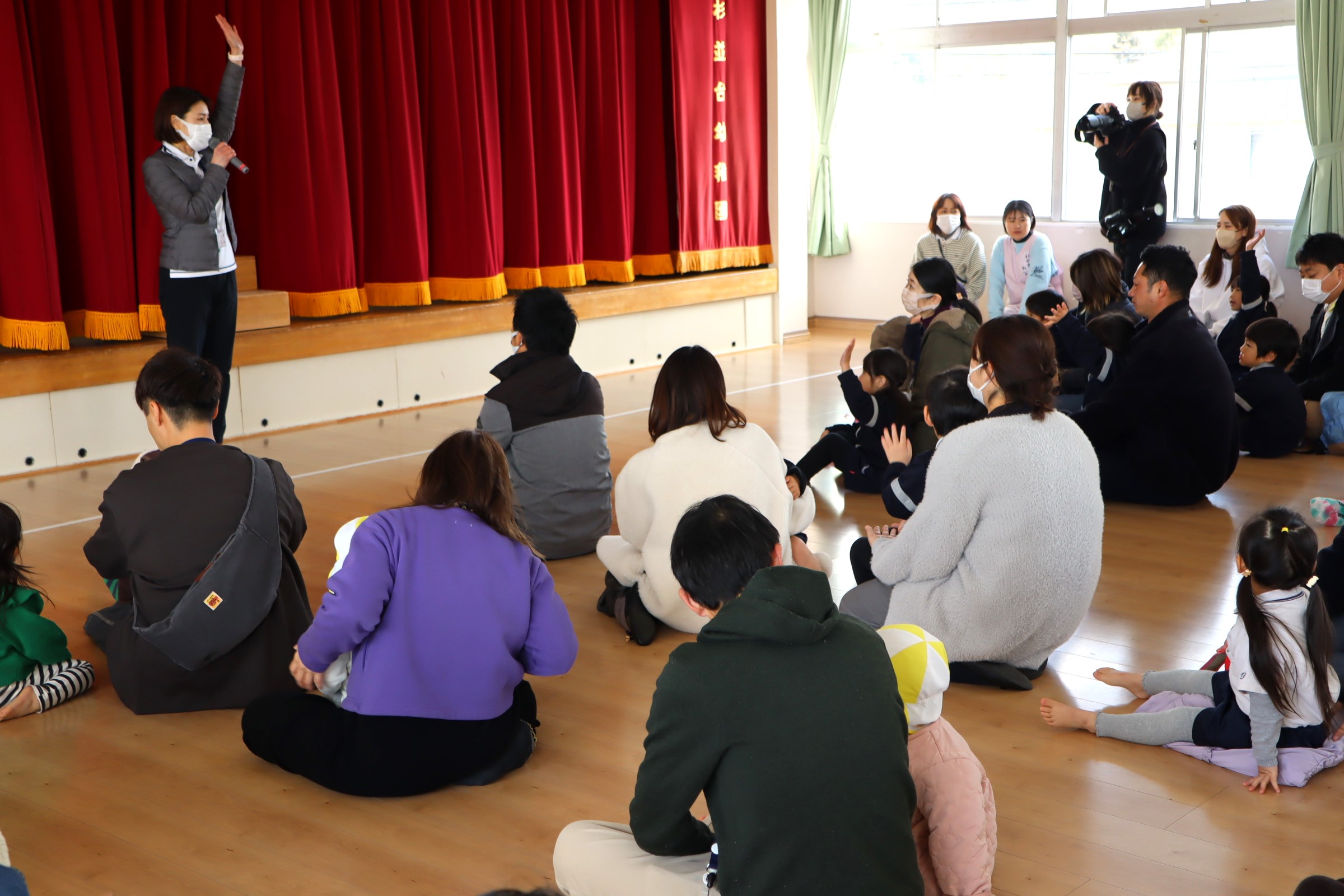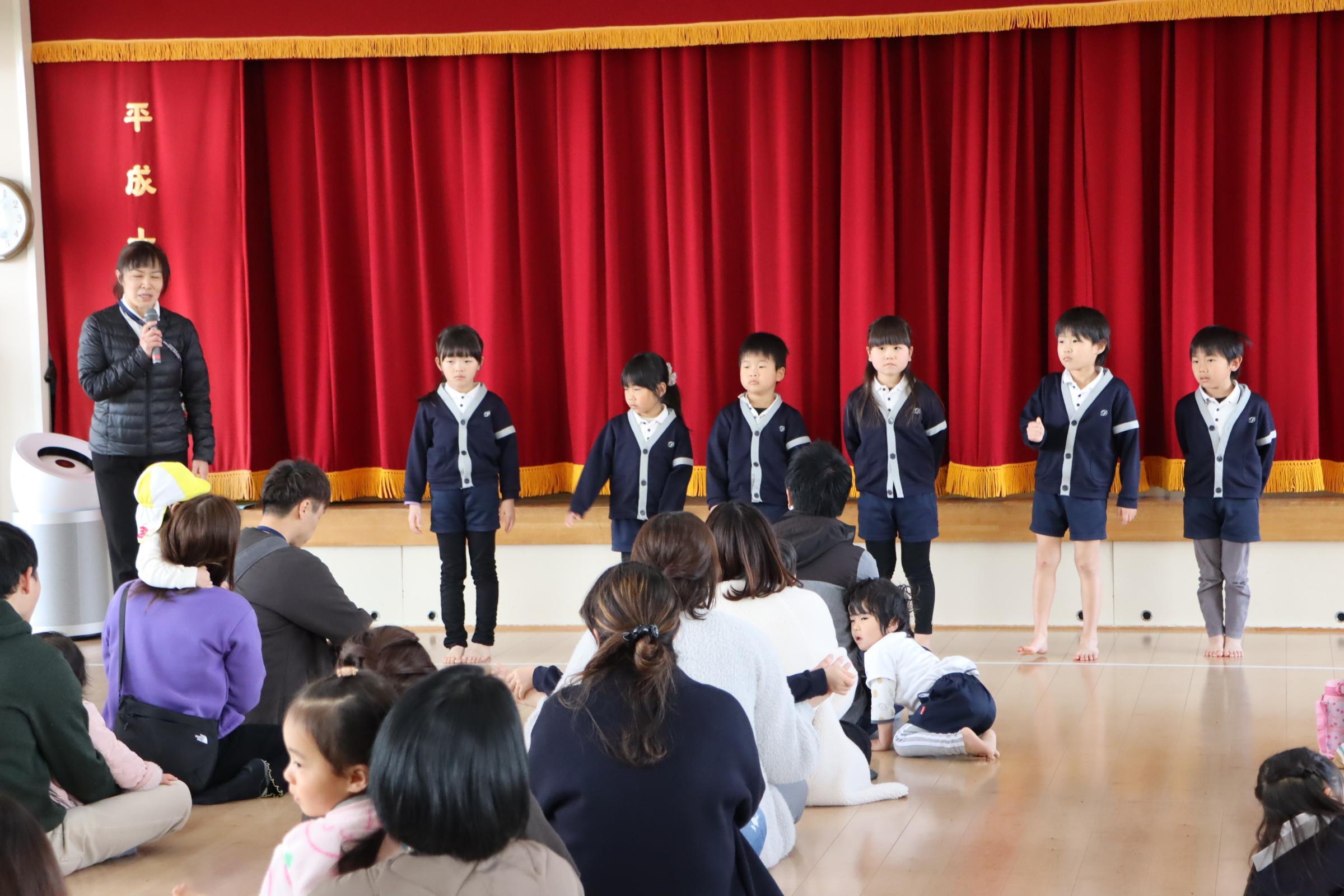 | 【お別れ遠足】 この日は、気温がとても低く、こども達のことを考えて、急遽室内での遠足としました。 | 卒園するこどもたちから、これからがんばることを伝えてもらいました。 |