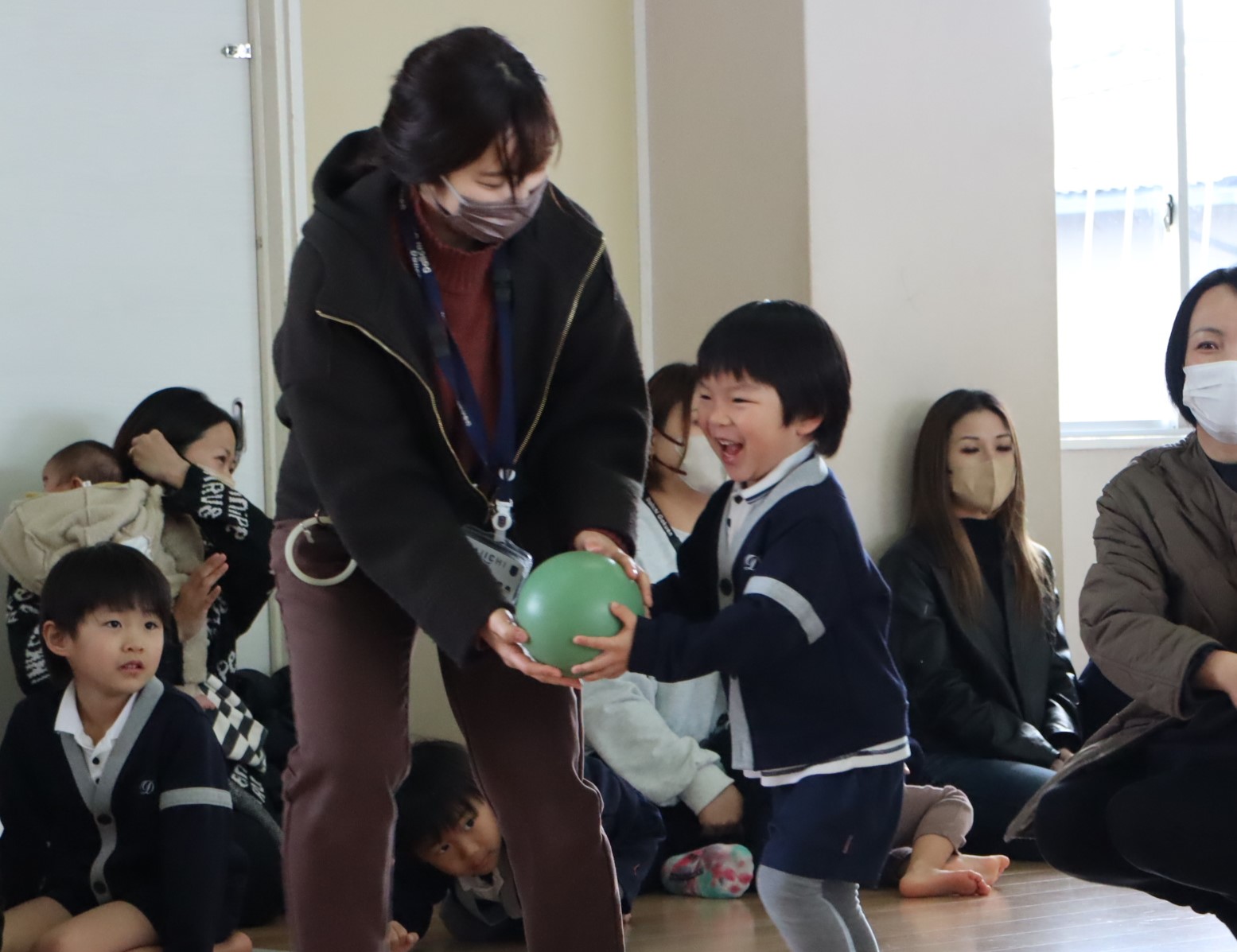 | | みんなで身体を動かしましょう♪ | 親子でボール運び♬ みんなでふれ合いながらのゲームは、大変盛り上がりました! |