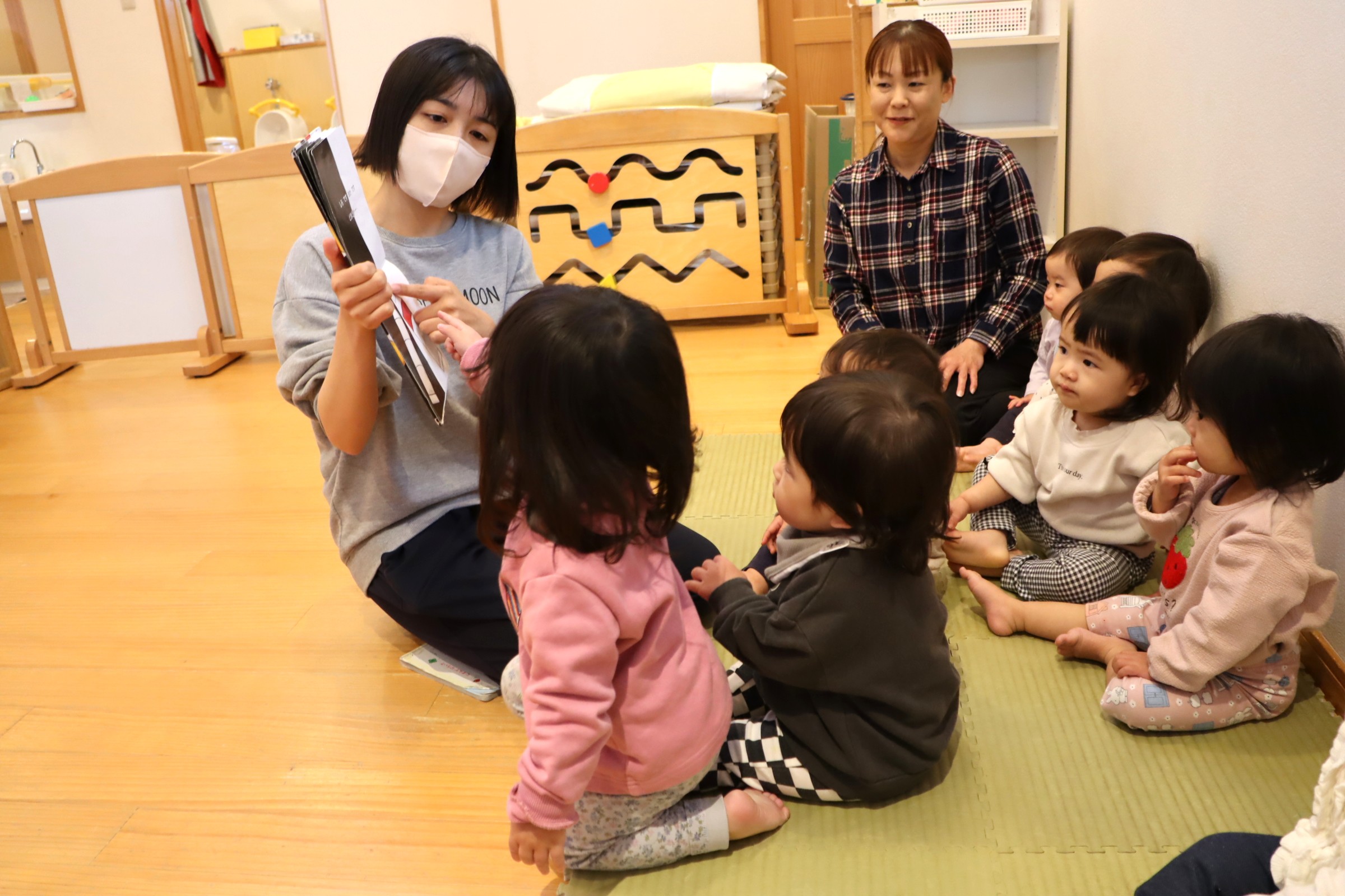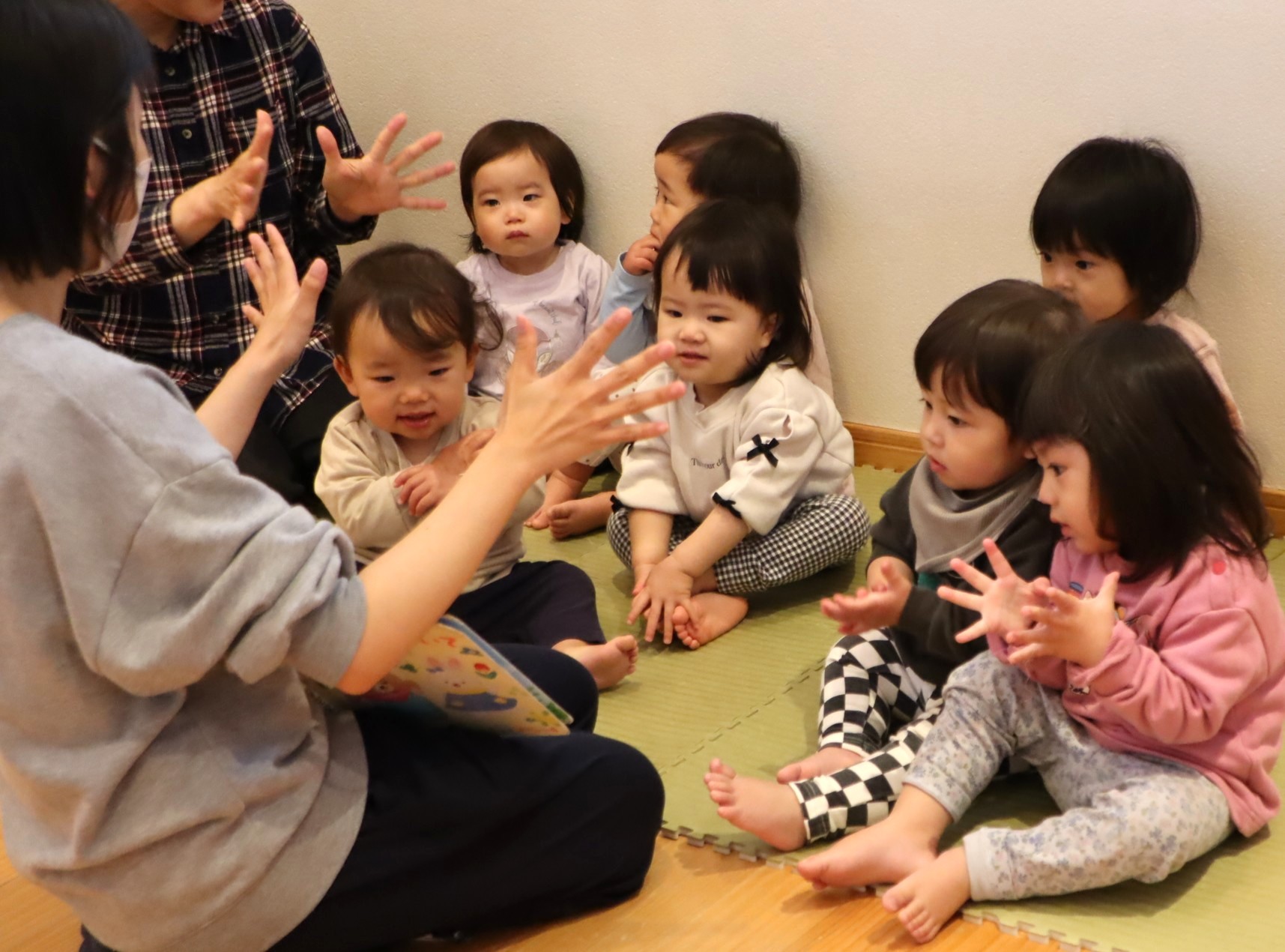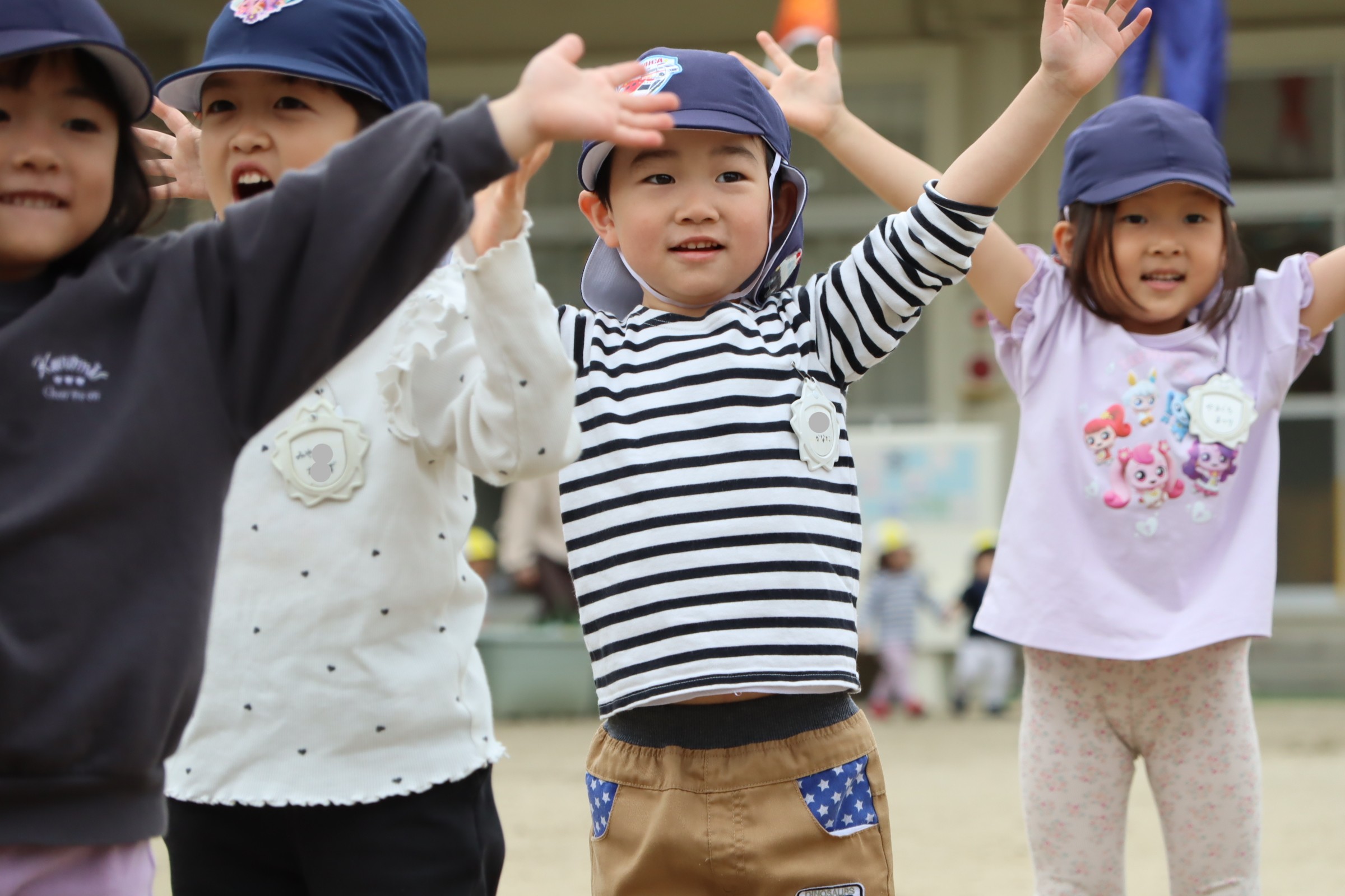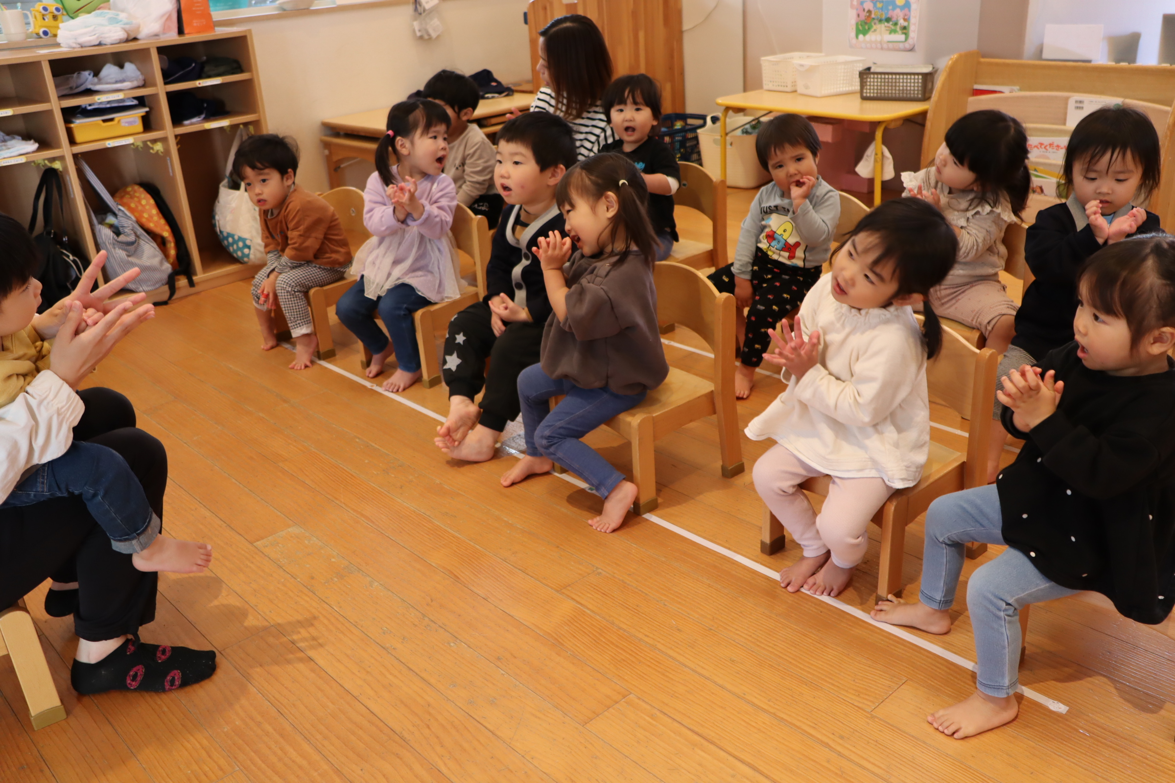 2歳児は、歌声や身振りで表現しながら季節のうたを楽しんでいます。戸外で体を沢山動かそう!