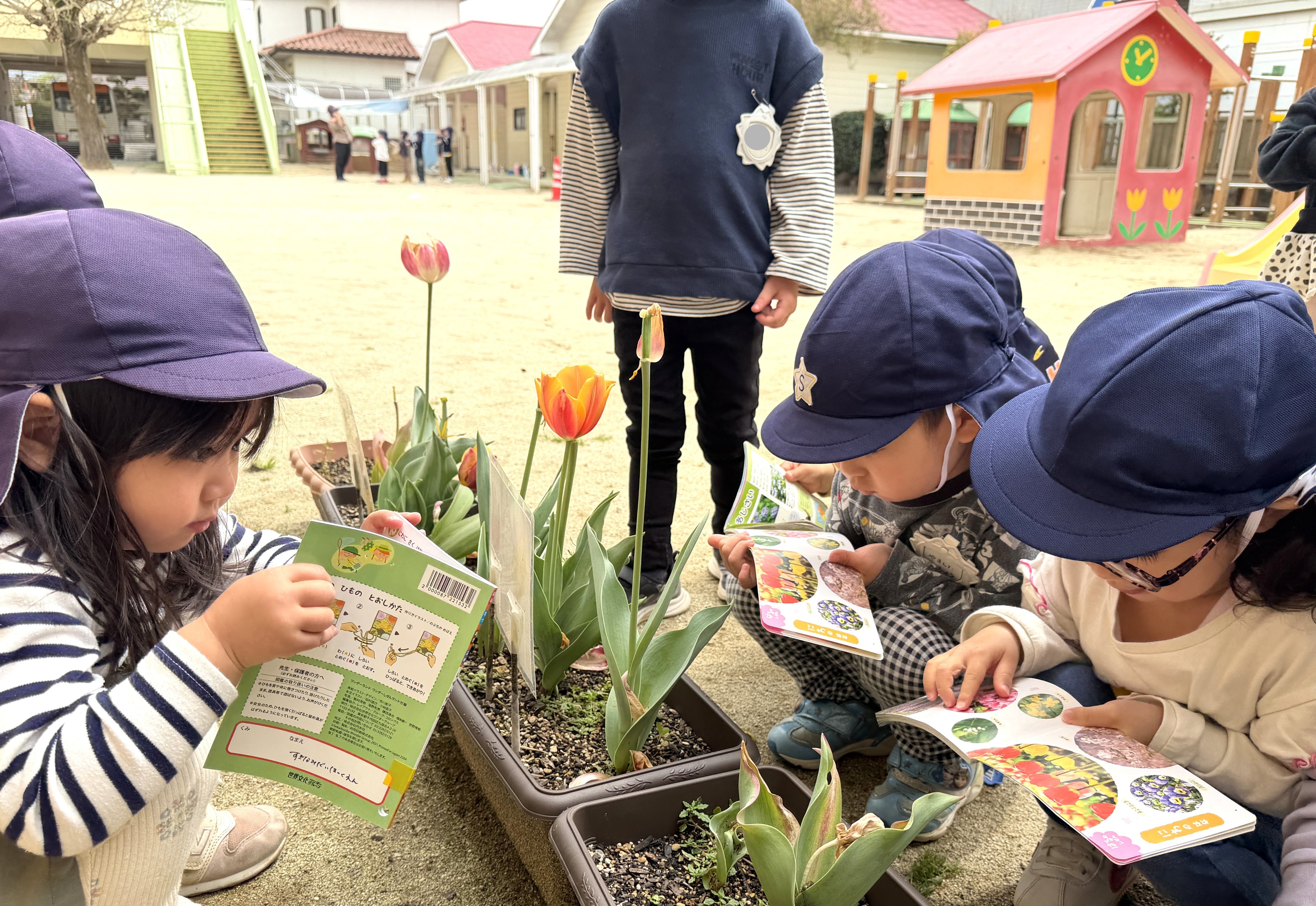 春の自然に触れる遊びも大好きです。咲いているチューリップと図鑑とを見比べて観察中。