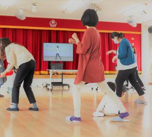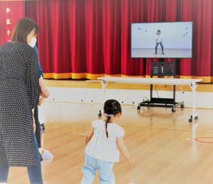 学園オリジナルたいそう『どうぶつたいそう』で心と体をリラックス 「ねこのポーズでアキレス腱のばし!」 | 『ぞうさん』になって足踏み ドシン♪ ドシン♪ |