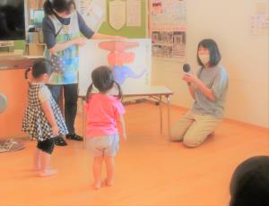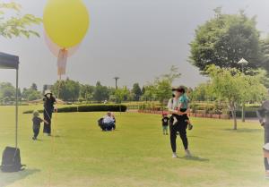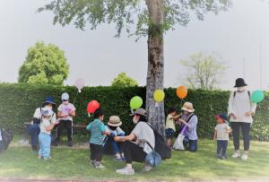 | 最後に、笑顔いっぱいで参加してくれたくらぶの子どもたちに風船のプレゼント♪ | 少し日差しが暑かったのですが、開放的な空間で親子同士の触れ合いを楽しみました。 |
