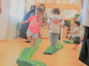 平均台の “くねくね” “でこぼこ” 道 バランスを取りながら自分で進むことができました。お友だちと一緒にたくさん体を動かして楽しかったですね! |