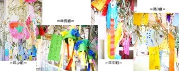 さあ!今日は「七夕」です。○、△、□に切った折り紙を使って飾りを作って、学年毎にひよこ組は「さかな」、年少組は「大きなトマト」、年中組は「お化けちょうちん」年長組は「吹き流し」をそれぞれ工夫して作りました。願い事はお家の人と一緒に考えて短冊に書き、飾りました。「CO2が減りますように」「ドラえもんに会えますように」「困っている人を助けたい」「大きくなって、強くなりたい」など、夢と希望を持った願い事でした。今夜はきっと織姫さま、彦星さまは会えたことでしょう。みんなの願い事もかなえられますように・・