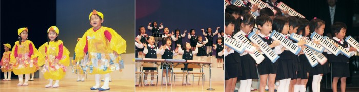 年長組さんは、「ウルトラマンメドレー」「新世界」「学園天国」の曲を階名で歌いながら、そしてお互いの『音』を聞きながら合奏しました。今まで自主的に練習してきた成果があらわれ、保護者の皆様からたくさんの拍手をいただき、子ども達は「みんなで力を合わせてすると、こんなにすごいものになるんだ」ということを、経験し、実感したようです。保護者の皆様から「子ども達すごいですね」「感動しました。涙がでました」と、あたたかいことばをいただきました。