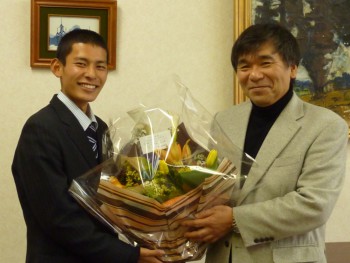 新聞やニュースでご存知の方も多いと思いますが、全国高校駅伝で九州学院高校陸上部の皆さんが全国3位という成績でした。その中で1区を走り、区間賞という素晴らしい結果を出した久保田かずま君は、園の卒園生です。以前から園長をはじめ前副園長(現学園アドバイザー)や職員は、テレビや新聞を通して成長した久保田君の活躍を知り、その度に感動し喜んでいました。いつか会ってその勇姿を称えたいと思っていたところ、先日、その思いが通じ、お母様と一緒に来園していただく機会が出来ました。久保田君の幼少時代から変わらない笑顔は、その当時を知る園長や前副園長にとって懐かしく何ものにも変えがたい喜びとなりました。