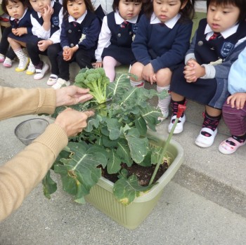 ひよこ組のテラスでは、秋に植えた野菜が寒風の中すくすく育ってきました。ここ数日の暖かな陽気に硬くしまっていたブロッコリーの蕾も少しずつ開きだし食べごろとなったので、みんなで収穫しました。一人一房ずつ大切そうに手で房をちぎり、その後、塩茹でされたブロッコリーは、鮮やかな深緑に変身。マヨネーズをつけて食べるとたくさんの子どもが「おかわり」を求め、友だちと一緒に取れたての野菜のおいしさを味わうことができました。